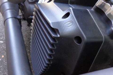 Optisch sind die Kühlrippen vom Motor in die Abdeckung übernommen. Jede Abdeckung wird aus einem Alublock CNC-gefrässt und in Schweizer Qualität hergestellt. Die Kühlrippen reduzieren die Oeltemperatur um 8 Grad. Die Motostyling-Abdeckungen sind nicht nur optische sondern auch funktionale Highlights.