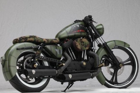 Der Army-Sportster sollte nicht nur speziell aussehen sondern auch spezielles Zubehör haben. So haben wir Gabel- und Fussrasterbereich verschiedene Patronenhülsen eingebaut und den Sattel mit einem Stück von einem Tarnanzug aus dem Armyshop überzogen. Das Bike hat nich diverse andere Teile die das Militär-Thema unterstützen.